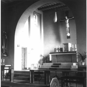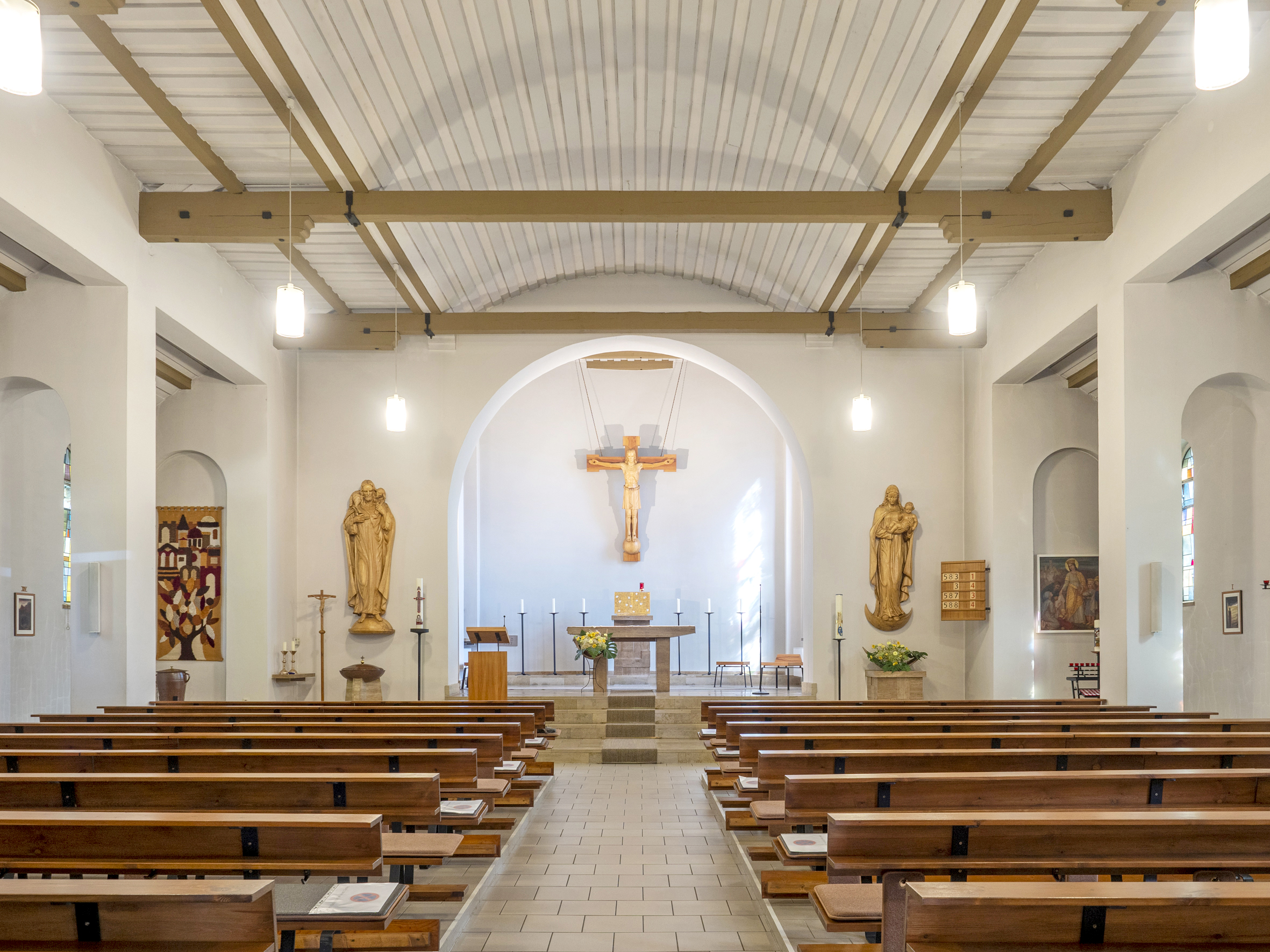 Das seit der Kirchweihe hängende Kreuz aus Kiefernholz bekam seine dritte Christusfigur im Jahr 1960. Der triumphierende Jesus, wieder von Hertelt geschaffen, wurde während der Karfreitagsliturgie feierlich enthüllt und breitet seitdem seine segnenden Arme über unsere Gemeinde aus. Eine kleine Veränderung gab es anschließend aber noch. Pfarrer Müller ließ den Kopfbalken des Kreuzes in den siebziger Jahren auf die heutige Länge einkürzen.