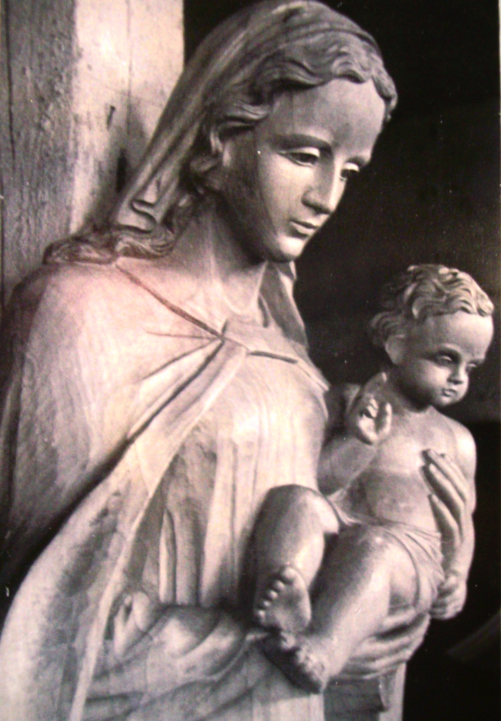 Zuerst schuf Hertelt unsere Figur der Mutter Gottes als Mondsichelmadonna, die am 26. August 1956 geweiht wurde. Nur ein Jahr später wurde die Figur des Guten Hirten zum Fest Christkönig als Gegenstück zur Maria angebracht und geweiht.